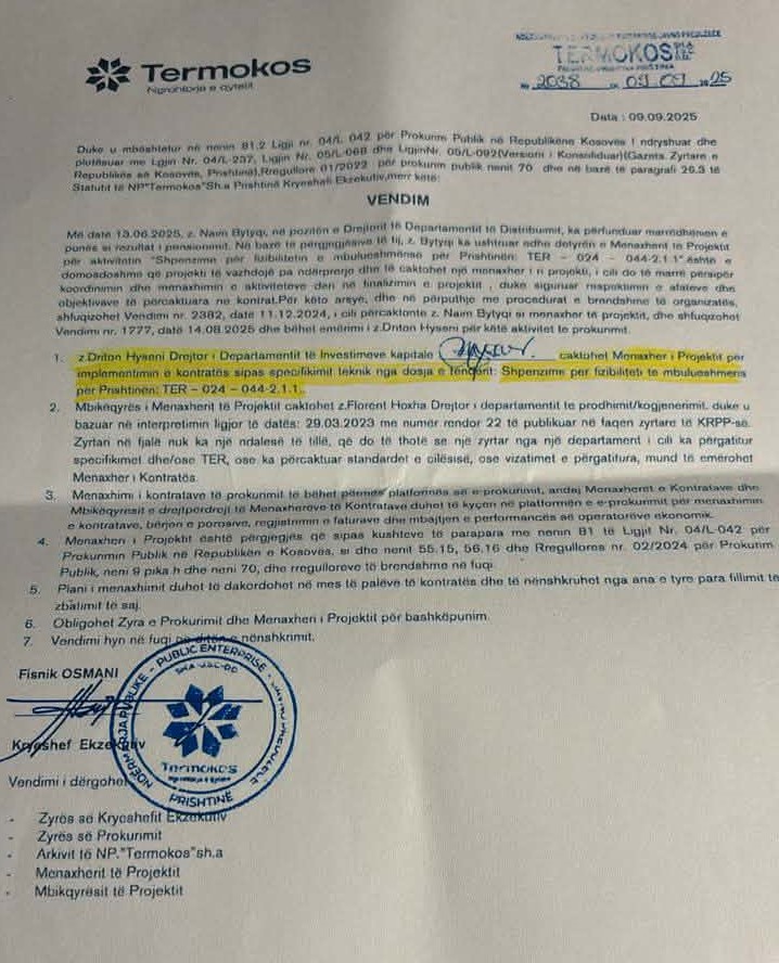 Kujdestari.info posedon një dokument të nënshkruar nga ish-kryeshefi i Termokos-it, Fisnik Osmani, ku Driton Hyseni caktohet menaxher i projektit për implementimin e kontratës “Shpenzimet për fizibilitet të tubacioneve për Prishtinën”, me numër të brendshëm TER-024-044-2.1.1.