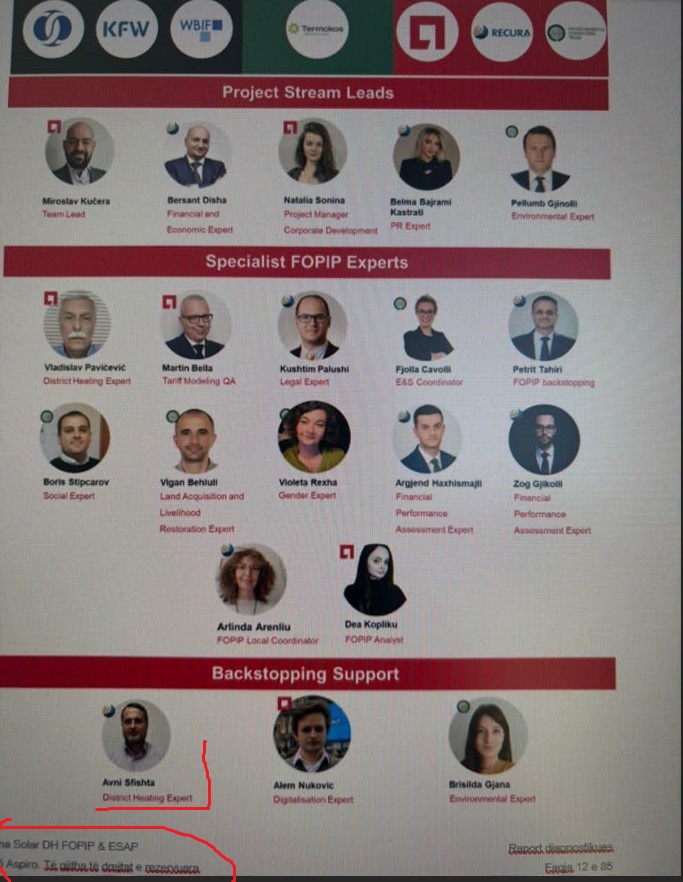 Në një dokument që paraqet strukturën e ekipit të projektit solar të Termokos-it, Avni Sfishta figuron si pjesë e “Backstopping Support”, me rolin “District Heating Expert”, në kuadër të programit FOPIP & ESAP. Kjo do të thotë se ai figuron si ekspert në ekipin këshillues të projektit solar të Termokos-it.