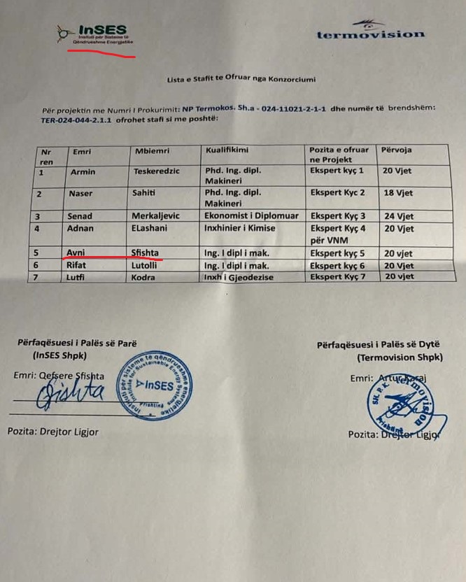 Por, këtu fillon pjesa që e ndërlikon rastin. Sipas dokumenteve që i posedon mediumi, në ofertën e paraqitur për këtë kontratë, si pjesë e stafit profesional të ofruar nga konsorciumi figuron edhe Avni Sfishta. Në listën e stafit të ofruar nga konsorciumi InSES–Termovision, Avni Sfishta paraqitet si “Ekspert kyç 5”.