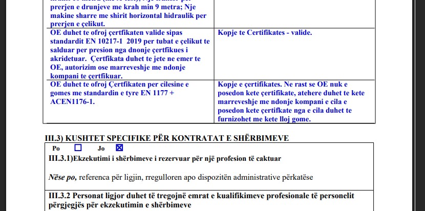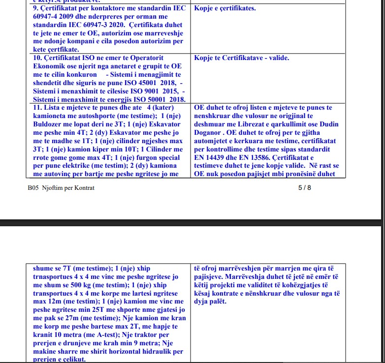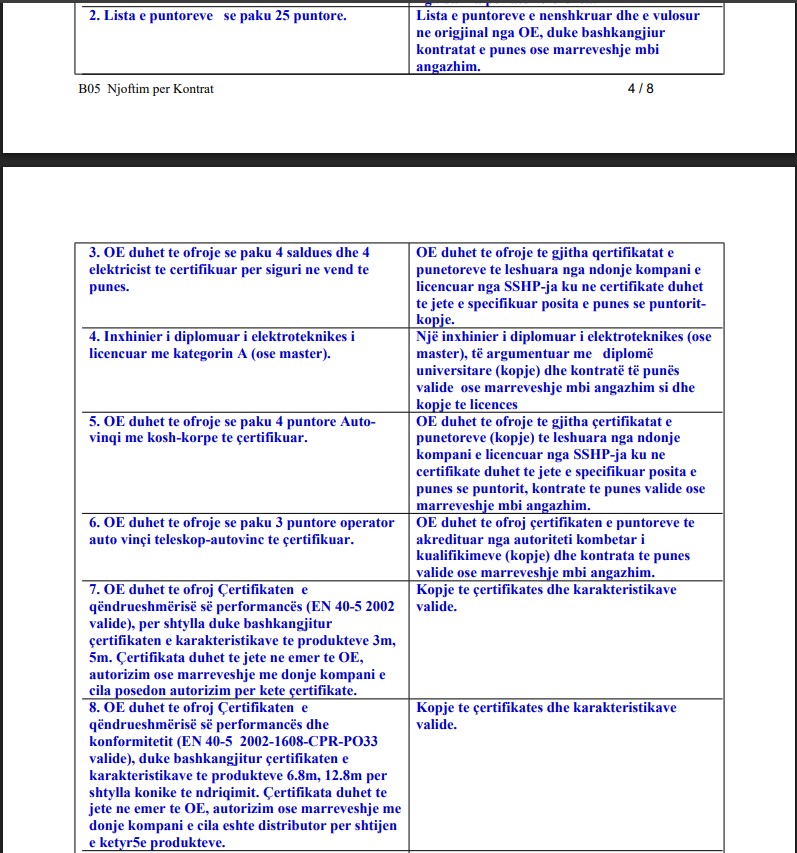 4 punëtorë me autovinqi me kosh-korpe të certifikuar + 3 operatorë auto-vinçi teleskop – kërkesë e pazakontë për një tender të tillë. Edhe nëse autovinçi nevojitet, përcaktimi i numrit dhe certifikimeve të tilla është kufizues.