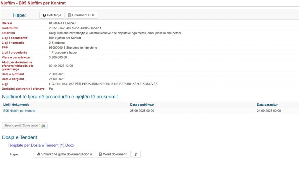 Tenderi është shpallur më 25 shtator 2025 dhe, sipas njoftimit për kontratë, mbetet i hapur deri më 10 tetor 2025.
