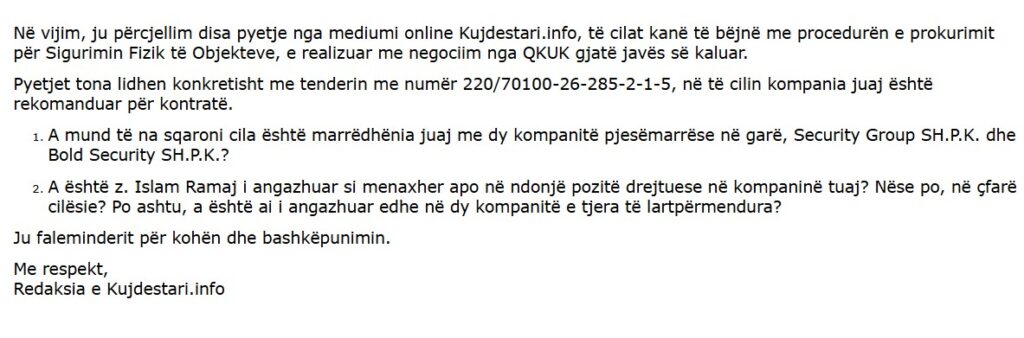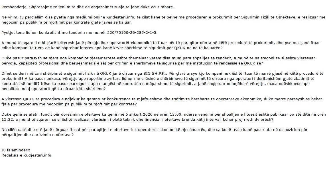 Kujdestari.info ka dërguar një mori pyetjesh në Zyrën e Prokurimit dhe Zyrën e Informimit të QKUK-së.