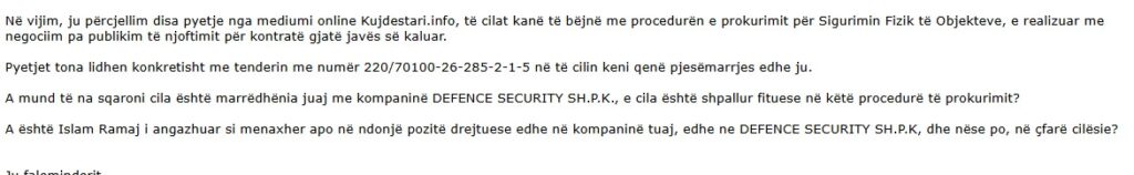 Kompania fituese DEFENCE SECURITY SH.P.K., sipas të dhënave të Agjencisë për Regjistrimin e Bizneseve të Kosovës (ARBK), figuron në pronësi të Bekim Hotit dhe është themeluar më 24 shkurt 2023. Hoti njihet si aktivist i NISMA Socialdemokrate dhe ka qenë kandidat për deputet në zgjedhjet e 28 dhjetorit, ndërsa më herët ka shërbyer si asamblist në periudhën 2014-2018.