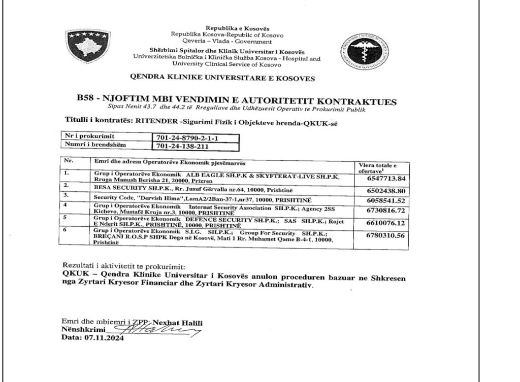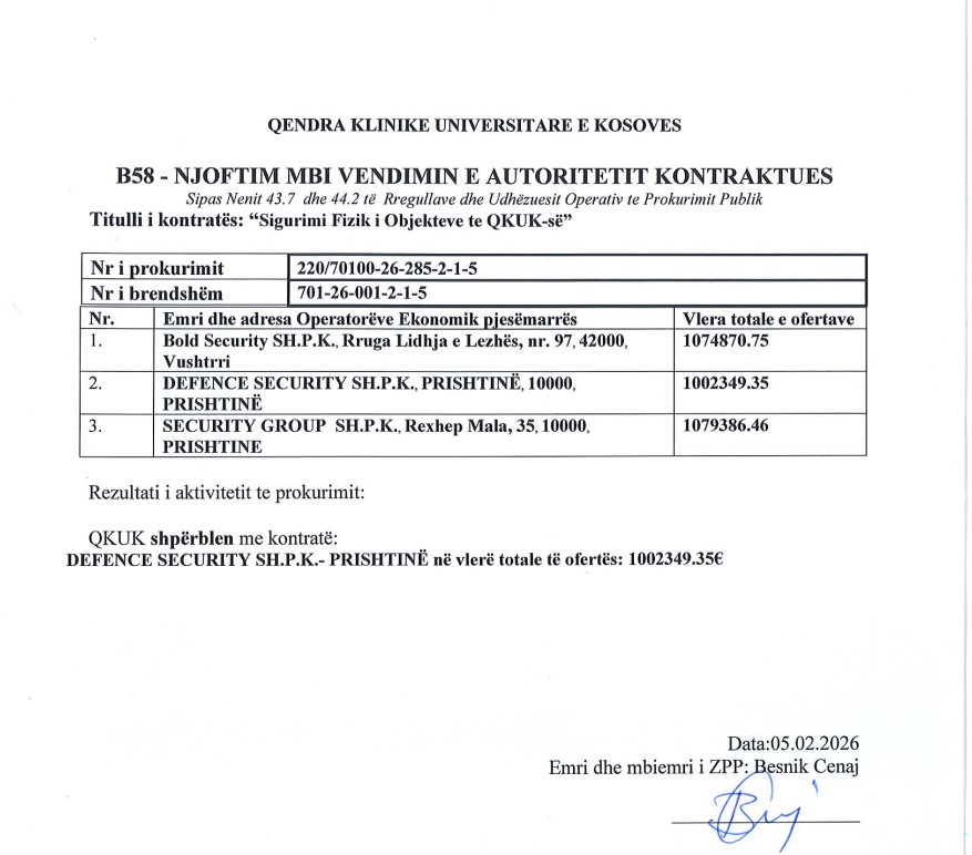 Qendra Klinike Universitare e Kosovës (QKUK) ka përfunduar brenda një dite të vetme procedurën e prokurimit për Sigurimin Fizik të Objekteve të QKUK-së, duke ngritur dyshime te mëdha mbi mënyrën e zhvillimit dhe vlerësimit të ofertave. Bëhet fjalë për një procedurë me negociim pa publikim të njoftimit për kontratë, çka në vetvete kufizon transparencën dhe konkurrencën, shkruan Kujdestari.info.