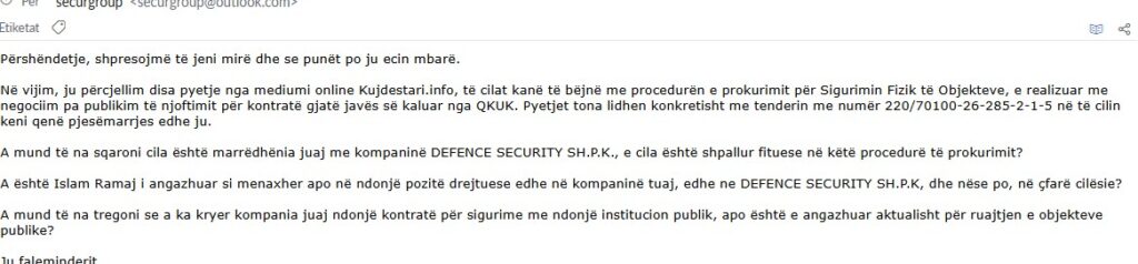 Bold Security SH.P.K. është themeluar më 13 tetor 2022 dhe figuron në pronësi të Arbenita Azemit, ndërsa SECURITY GROUP SH.P.K. është themeluar më 16 prill 2025, rreth 10 muaj para shpalljes së tenderit, dhe ka për pronar Etnik Lladrovcin.