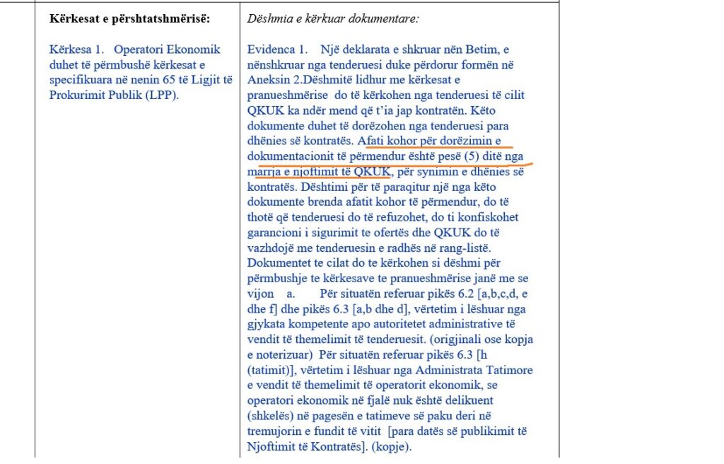 Ndërkohë, sipas dokumenteve të tenderit, bazuar në “Kërkesat e përshtatshmërisë – Kërkesa 1”, operatorët ekonomikë ishin të obliguar të përmbushnin kushtet e përcaktuara në nenin 65 të Ligjit të Prokurimit Publik (LPP). Aty parashihet qartë se afati për dorëzimin e dokumentacionit shtesë është pesë (5) ditë nga marrja e njoftimit për synimin e dhënies së kontratës, me paralajmërimin se mosdorëzimi i dokumenteve brenda këtij afati do të rezultonte në refuzim të ofertës dhe konfiskim të garancisë.