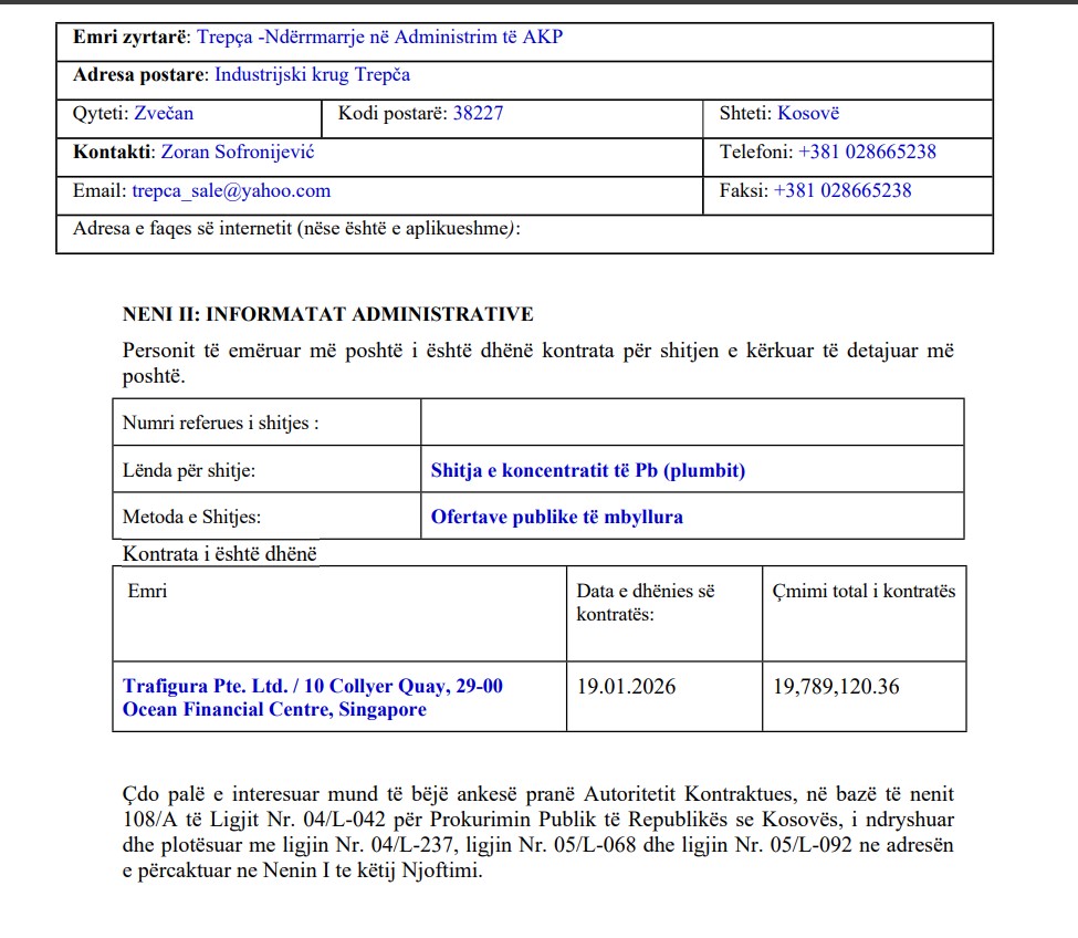 Sipas Njoftimit për Dhënie të Kontratës për Shitje, kontrata për shitjen e koncentratit të Pb (plumbit) i është dhënë kompanisë Trafigura Pte. Ltd., me adresë në 10 Collyer Quay, Ocean Financial Centre, Singapore. Kontrata është dhënë më 19 janar 2026, ndërsa vlera totale e saj arrin në 19,789,120.36 dollarë amerikanë.