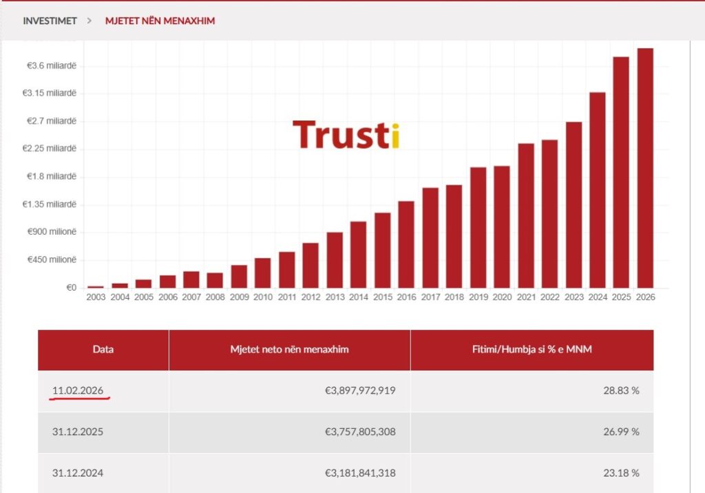 Krahasuar me fundin e vitit 2025, kur mjetet nën menaxhim ishin 3,757,805,308 euro, rezulton se Trusti ka rritur asetet për rreth 140 milionë euro në vetëm gjashtë javët e para të vitit.