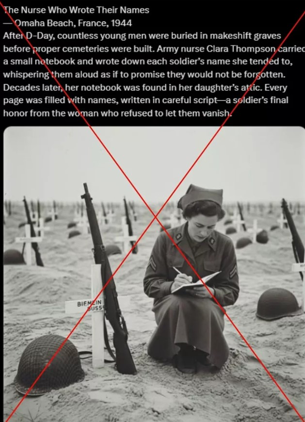 Në foto, infermierja e pretenduar nuk vesh një uniformë të saktë. Arkivat zyrtare tregojnë se infermieret ushtarake që shërbenin në Normandi vishnin rroba shumë të ndryshme nga ato që paraqiten në postimet në rrjetet sociale.